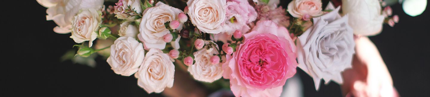 Nuotraukoje pavaizduota puokštė 50-55€ sumai. Ją sudaro bijūninės rožės, baltos frezijos, eukaliptas.
